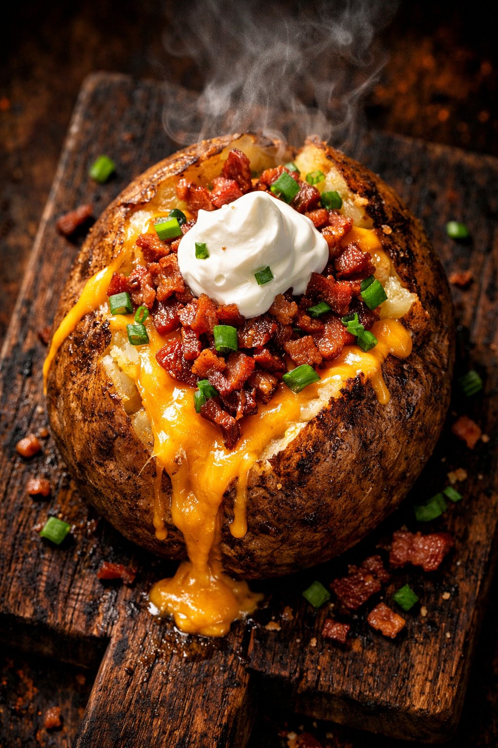 - Pile on the sour cream, sharp cheddar, crispy bacon crumbles, and a generous handful of fresh chives.